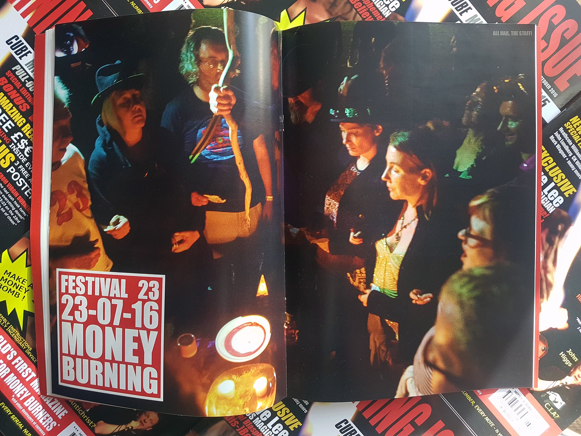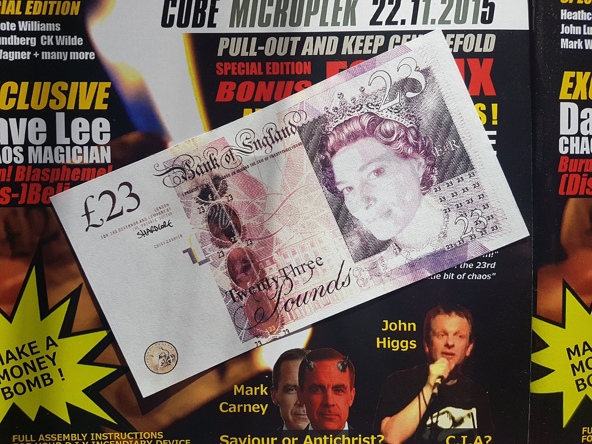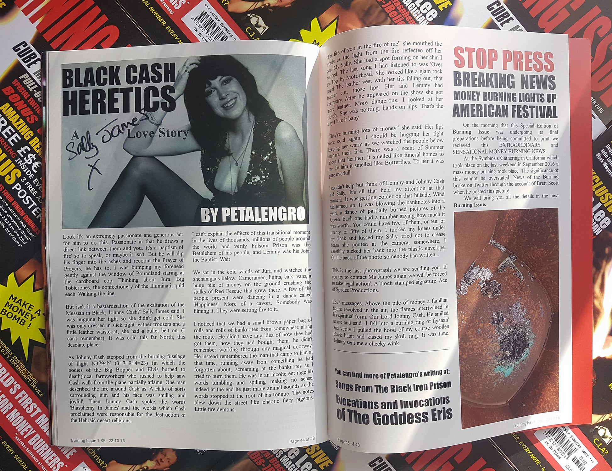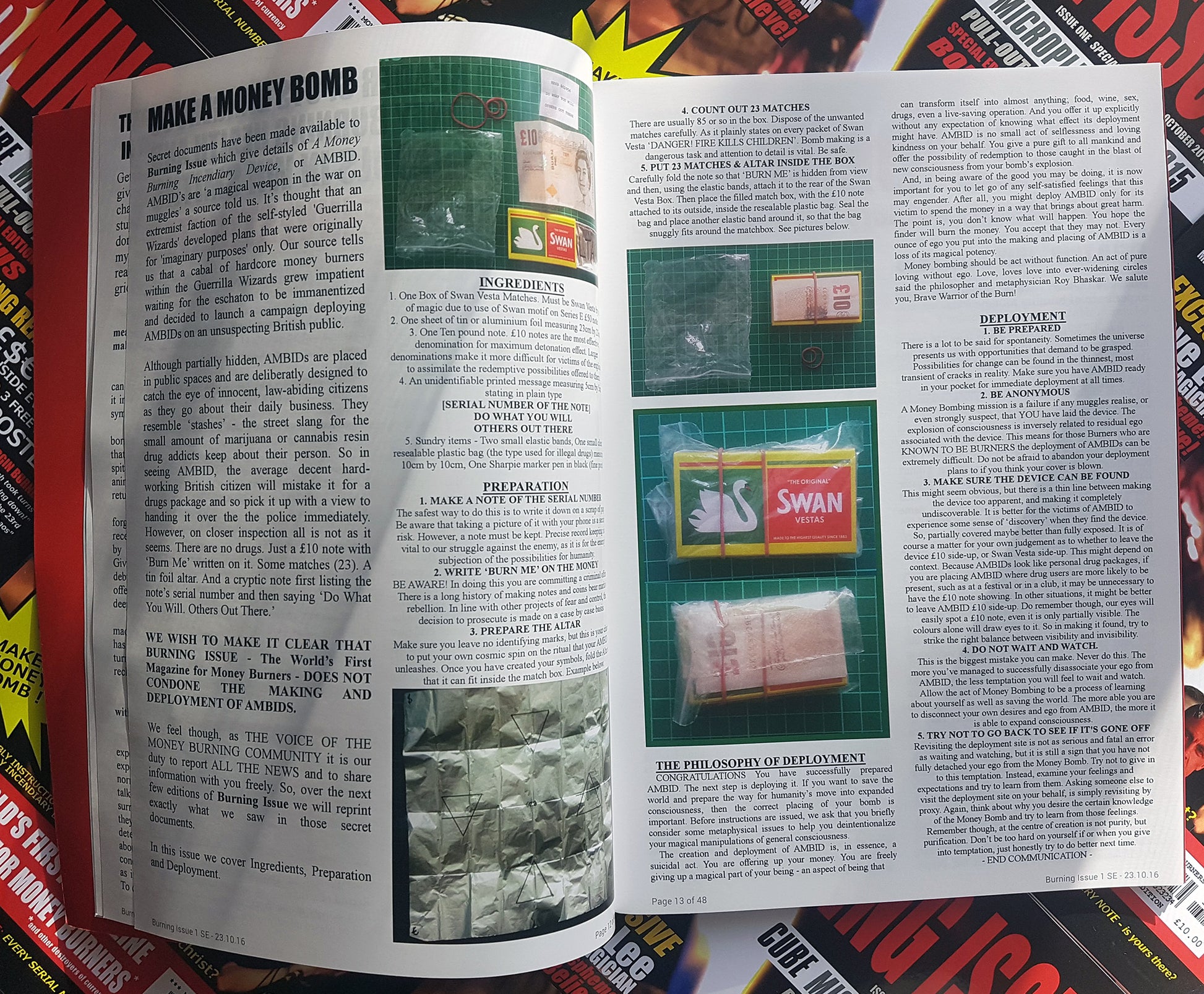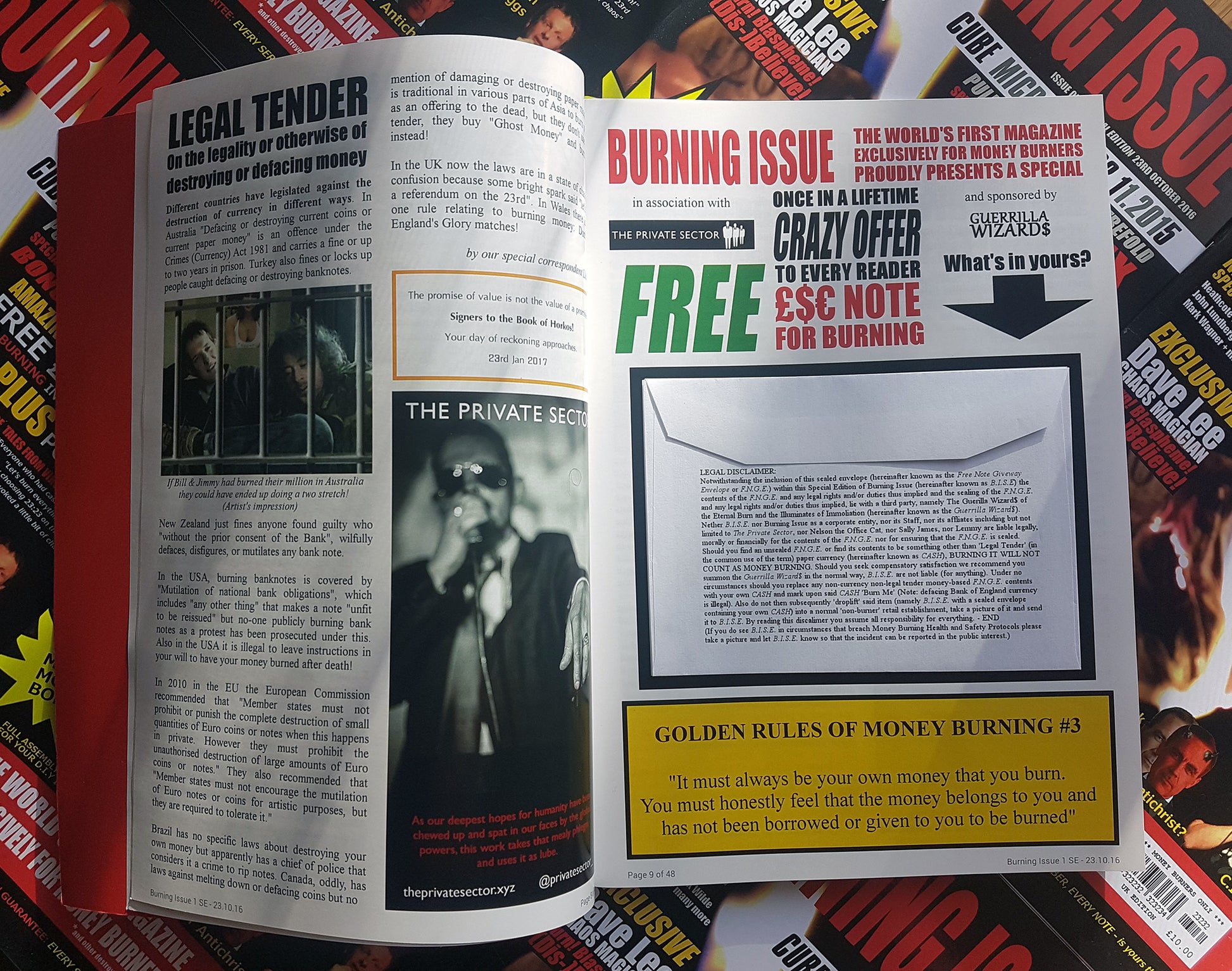 The second print run of Burning Issue was released to coincide with the first ever Ritual Mass Burn at The Cockpit, London. Available here are the few remaining copies from a run of 75. The 'free cash giveaway' offer is the 'Daisy Campbell' £23 note with Bill Drummond machine gunning at the Brit award on the reverse. The note is designed and hand-signed by Brighton based artist 'SHARDCORE'.